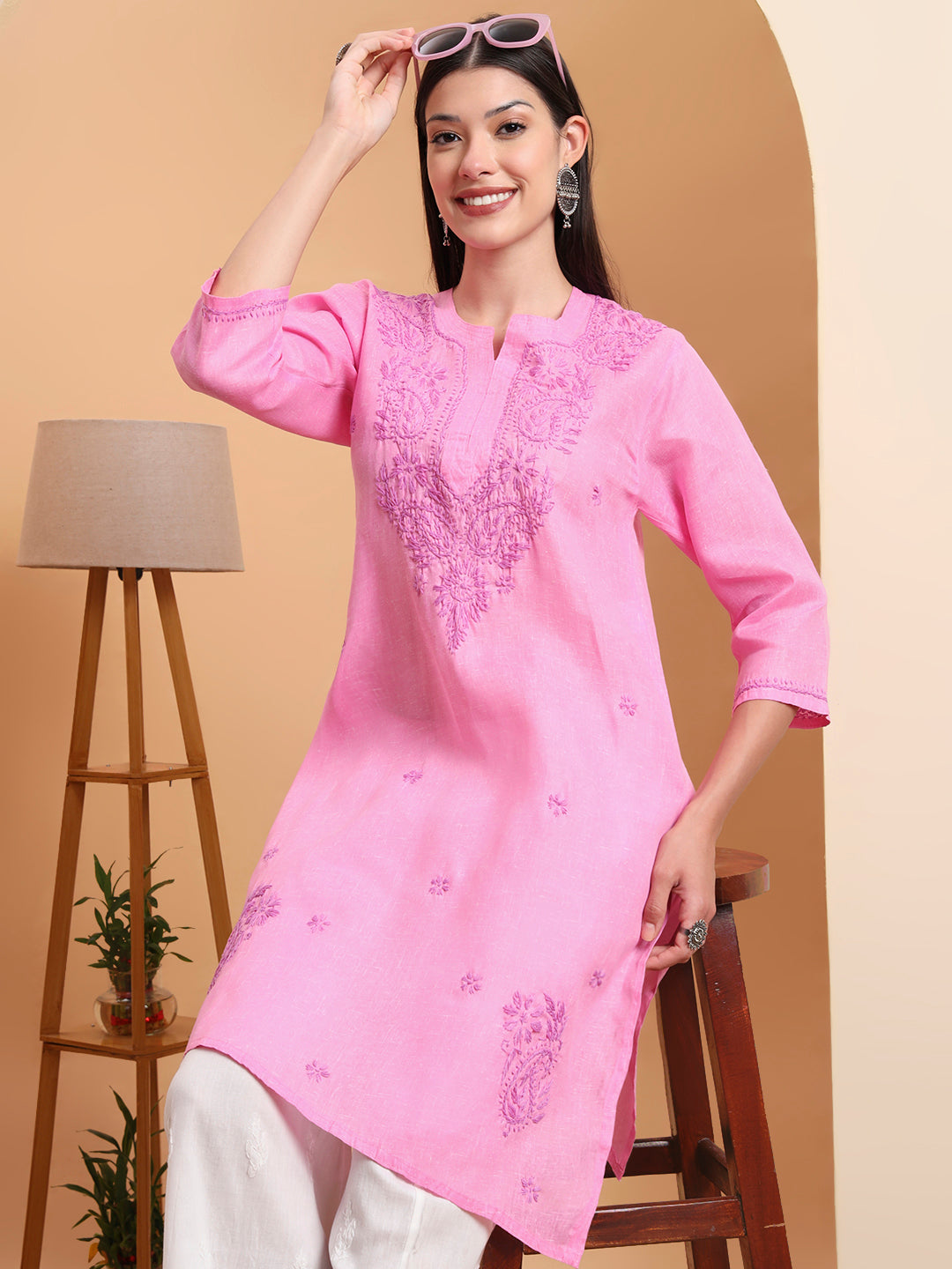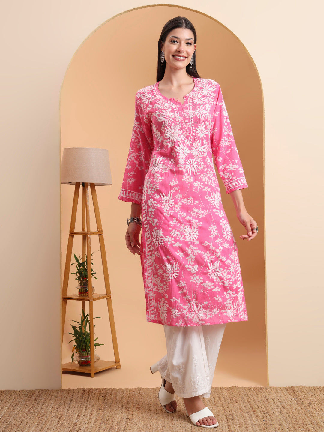 Ethnic Motifs Voil Cotton Straight Hand Embroidered Lucknowi Chikankari Kurta- Soft Pink